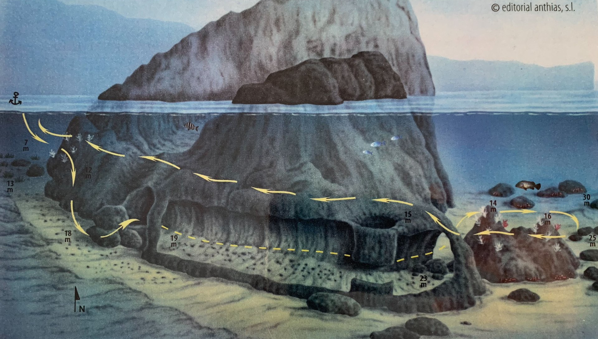 It is a wall dive inside a large tunnel where you can find multiple nudibranchs, scorpionfish and yellow polyps. Near the exit there is a chimney-shaped tunnel that reaches 8-10 meters deep. The use of a flashlight is necessary. Nudibranchs, moray eels, conger eel, sardines, sea bass, scorpionfish, octopus, cuttlefish and on rare occasions seahorses are usually seen.